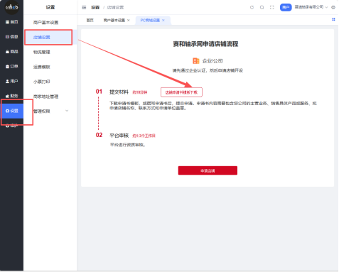 目录 搜索 登录商户开通店铺设置店铺添加商品添加品牌添加采购信息添加供应信息添加现货信息添加特价信息最新供应信息最新采购信息全链供应管理企业招标我的招标我要投标我的投标在线拍卖我的拍卖我的竞拍我要竞拍联合团购我的团购我的参与我已参团我要参团供应管理我要报名我的订单服务订单我的供应我的采购设置咨询 暂无相关搜索结果! 本文档使用 MinDoc 发布 开通店铺 开通店铺流程指引下载店铺申请书模板:登录商户后台后,进入【设置】页面,点击“店铺申请书模板下载”链接,将文件下载至本地电脑。填写并提交申请:根据模板要求填写完毕后,点击【上传】按钮上传文件。确认信息无误后,点击【提交申请】。提交成功后将进入平台审核阶段,请耐心等待审核结果。 温馨提示:申请书需完整填写并加盖公章后扫描上传,以确保顺利通过审核。审核周期通常为1-3个工作日,您可在商户后台查看审核进度。 文档更新时间: 2026-01-16 13:05 作者:Leo