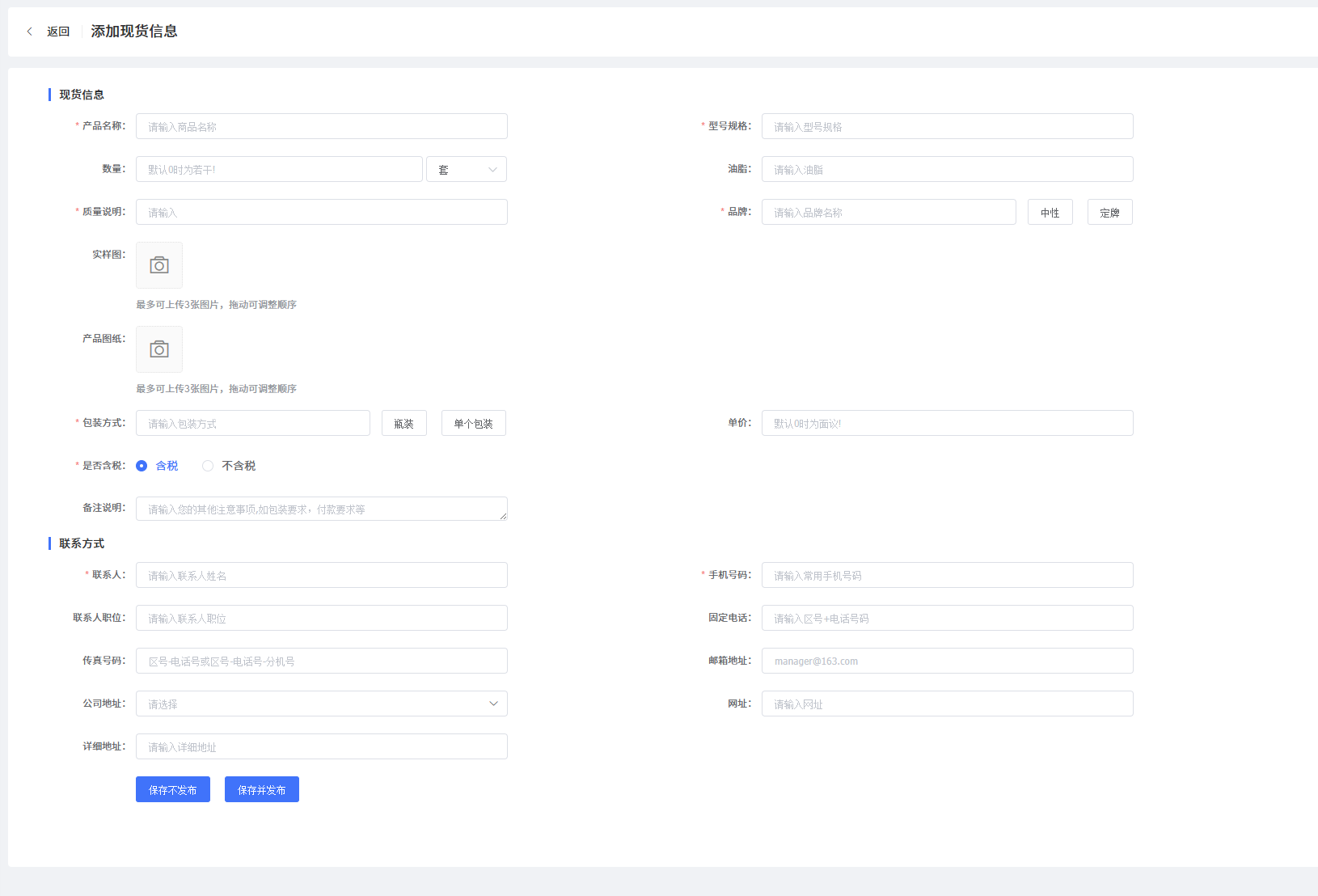 根据页面提示,完整填写您所持有的现货产品名称、规格、价格、所在地、库存量及可交付时间等信息。