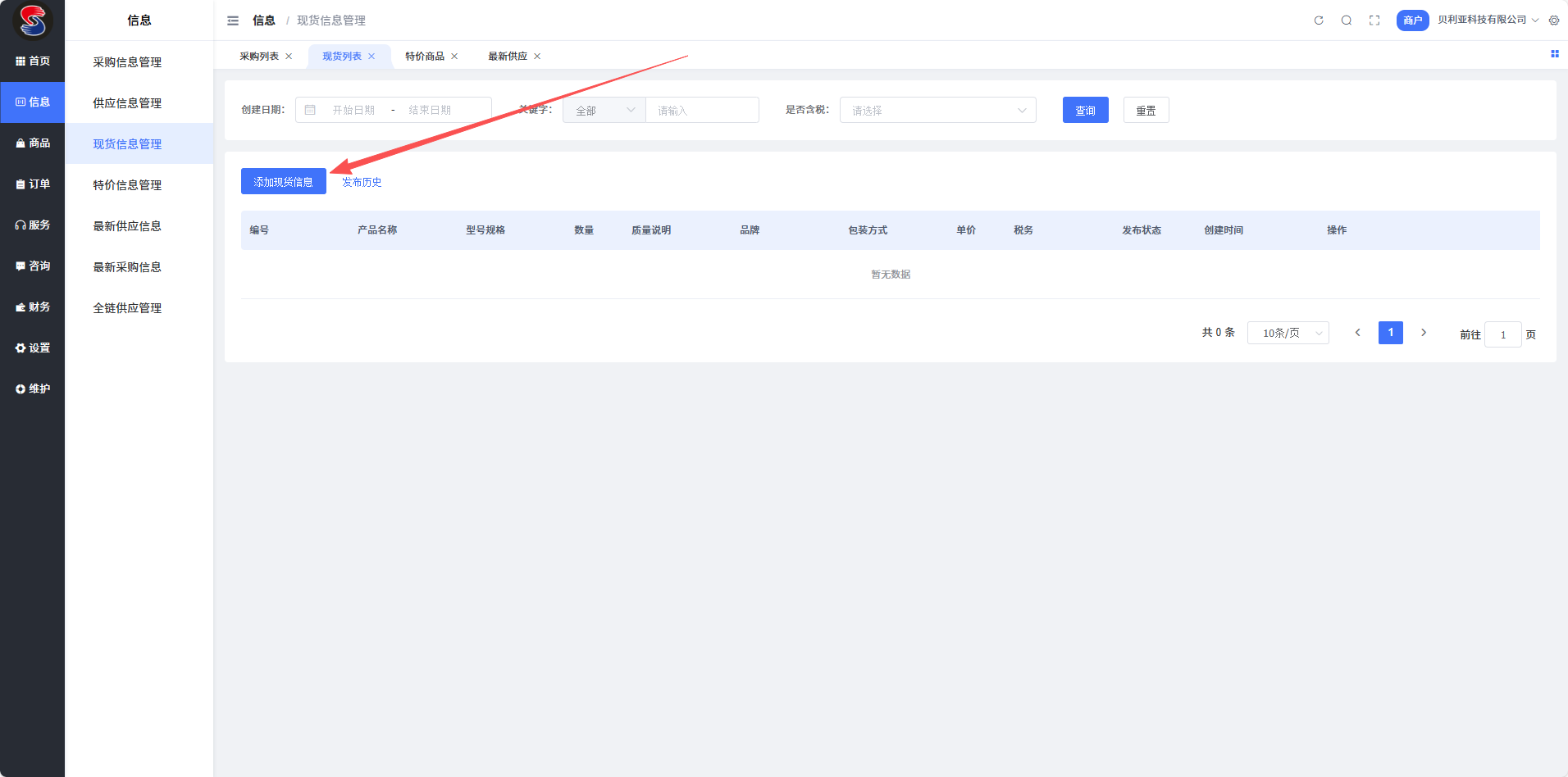 登录商户后台,依次点击【信息】-【现货信息管理】,进入现货信息管理页面,点击【添加现货信息】按钮开始发布。
