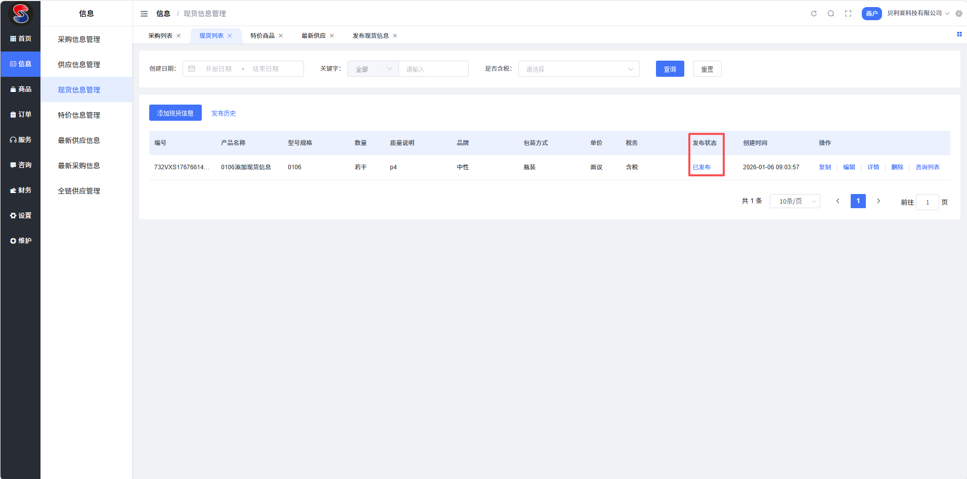 发布后,您可在“现货信息管理”列表中查看或管理已发布的信息。