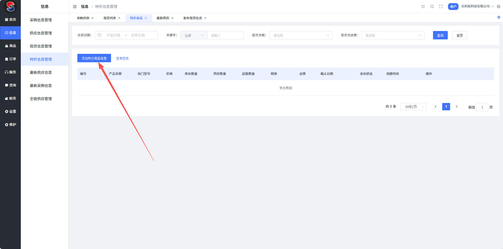 登录商户后台,依次点击【信息】-【特价信息管理】,进入特价信息管理页面,点击【添加特价信息】按钮开始发布。