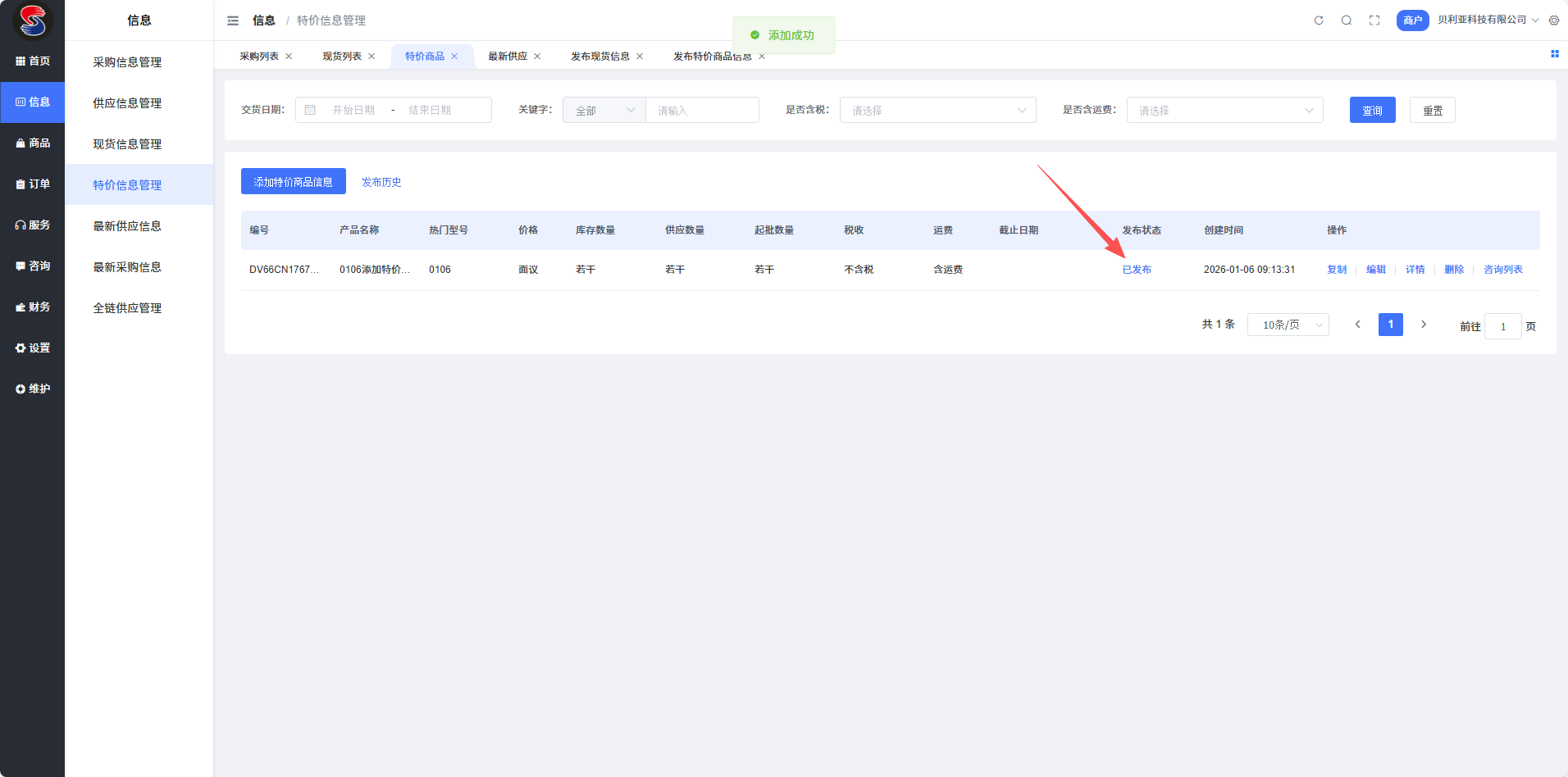 发布后,您可在“特价信息管理”列表中查看或管理已发布的信息。