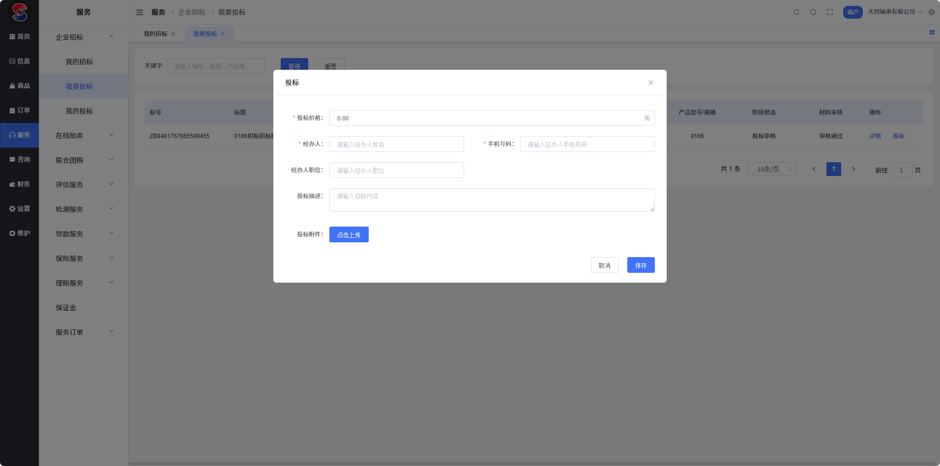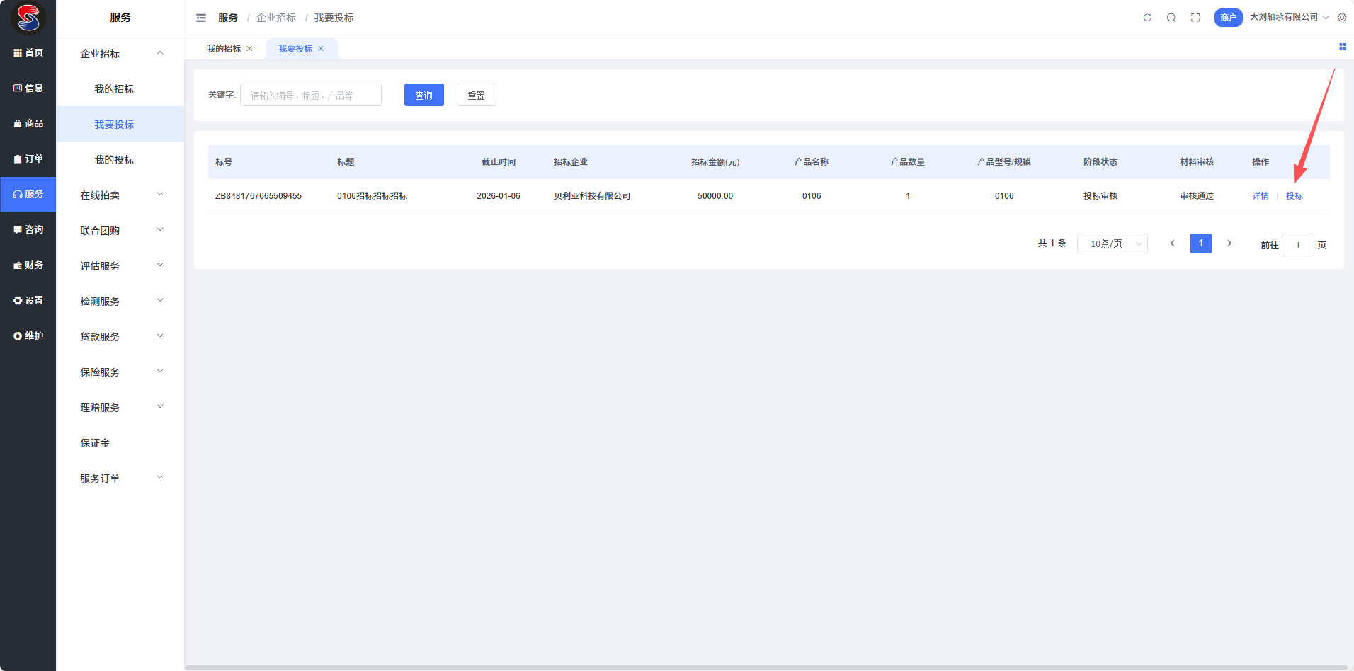 登录商户后台,依次点击【服务】-【企业招标】-【我要投标】,浏览招标项目列表,对意向项目点击【投标】操作按钮。