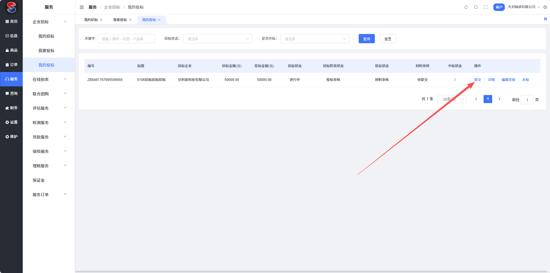 保存后系统将自动跳转至【我的投标】页面。找到已保存的投标记录,点击【提交】按钮,投标申请将进入“待平台投标审核”状态。
