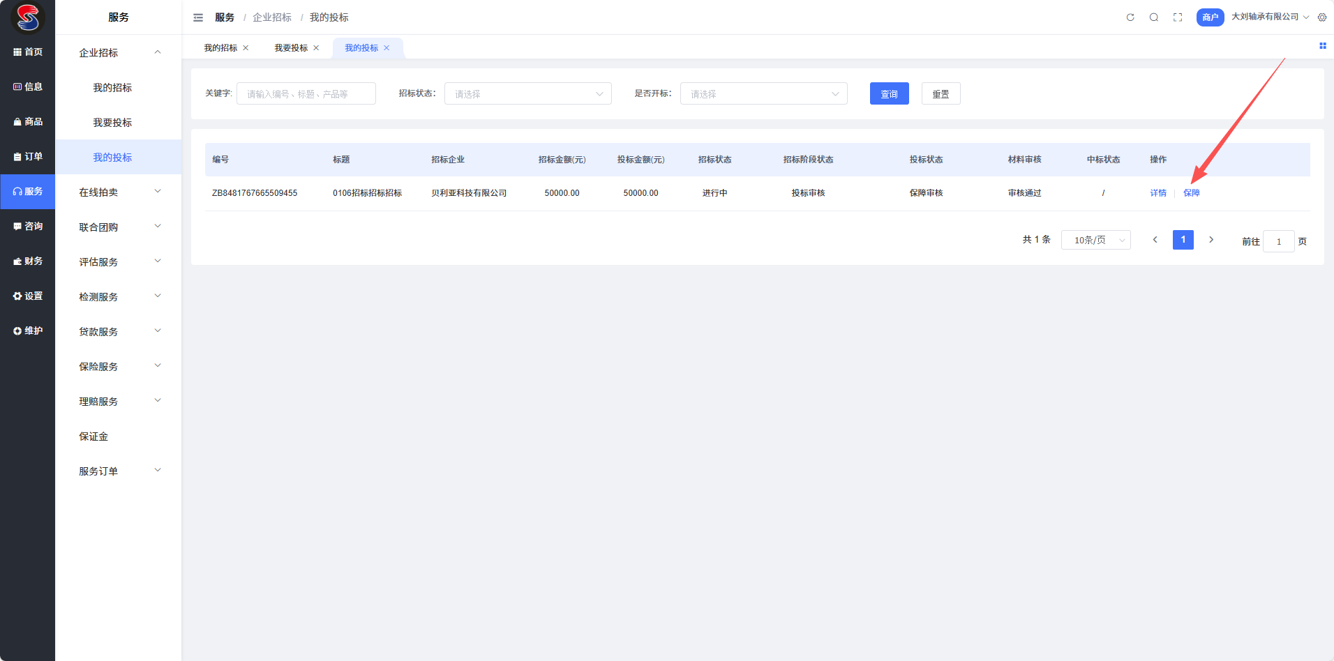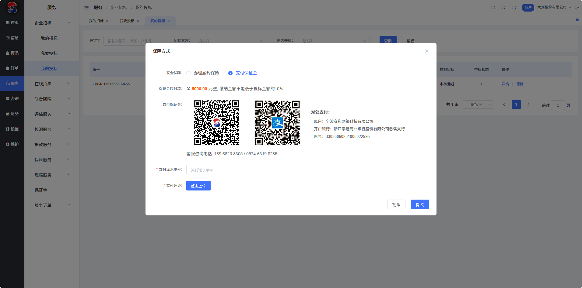 在对应的投标项目中,选择所需的保障方式(如支付投标保证金),根据系统指引完成保证金支付流程,点击【提交】完成保障操作。