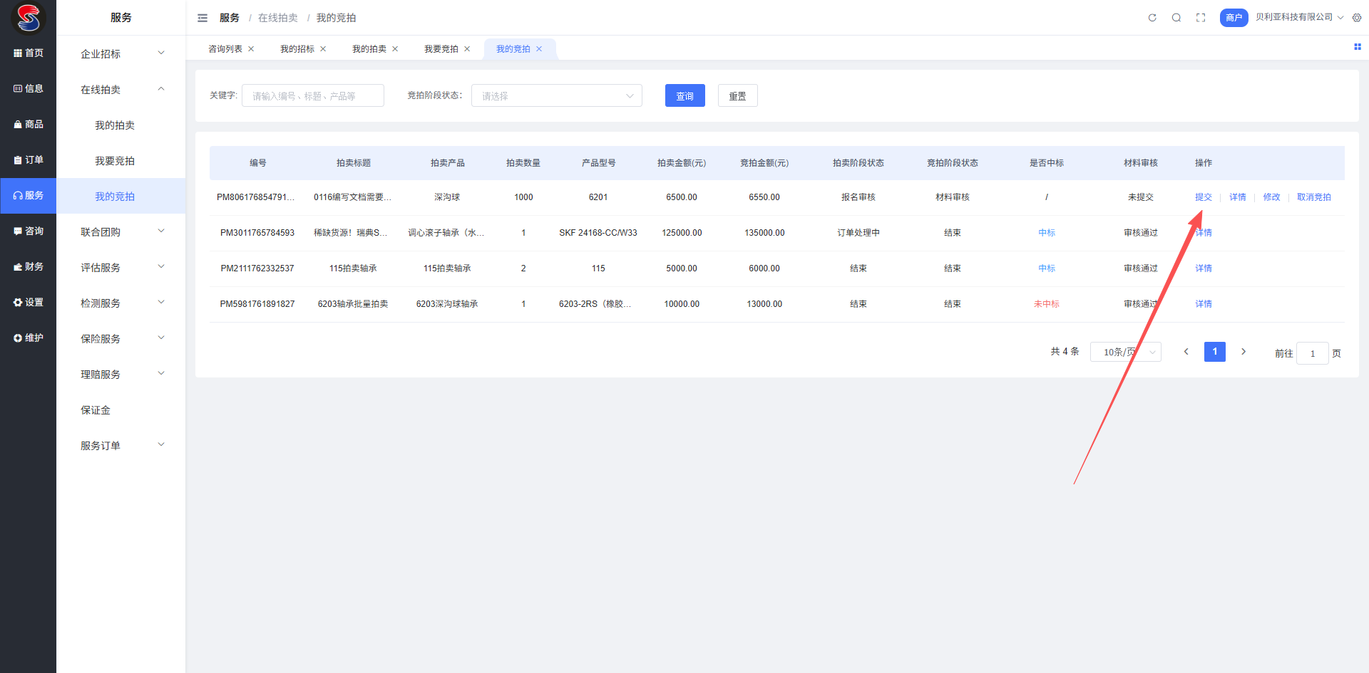目录 搜索 登录商户开通店铺设置店铺添加商品添加品牌添加采购信息添加供应信息添加现货信息添加特价信息最新供应信息最新采购信息全链供应管理企业招标我的招标我要投标我的投标在线拍卖我的拍卖我的竞拍我要竞拍联合团购我的团购我的参与我已参团我要参团供应管理我要报名我的订单服务订单我的供应我的采购设置咨询 暂无相关搜索结果! 本文档使用 MinDoc 发布 我的竞拍 我的竞拍操作指引提交竞拍申请:在拍卖项目中点击【提交】参与竞拍,您的申请将进入“待平台端审核”状态。 办理竞拍保障:审核通过后,点击【保障】按钮,选择并办理“履约保险”或“支付保证金”等要求的保障方式。办理成功后,项目状态将依次更新为“待平台支付审核”→“待平台发布”→“待公示”。 温馨提示:请及时完成保障办理,逾期未办理可能导致竞拍资格失效。支付保证金或办理保险后,请保留相关凭证以备查验。 文档更新时间: 2026-01-16 16:18 作者:Leo