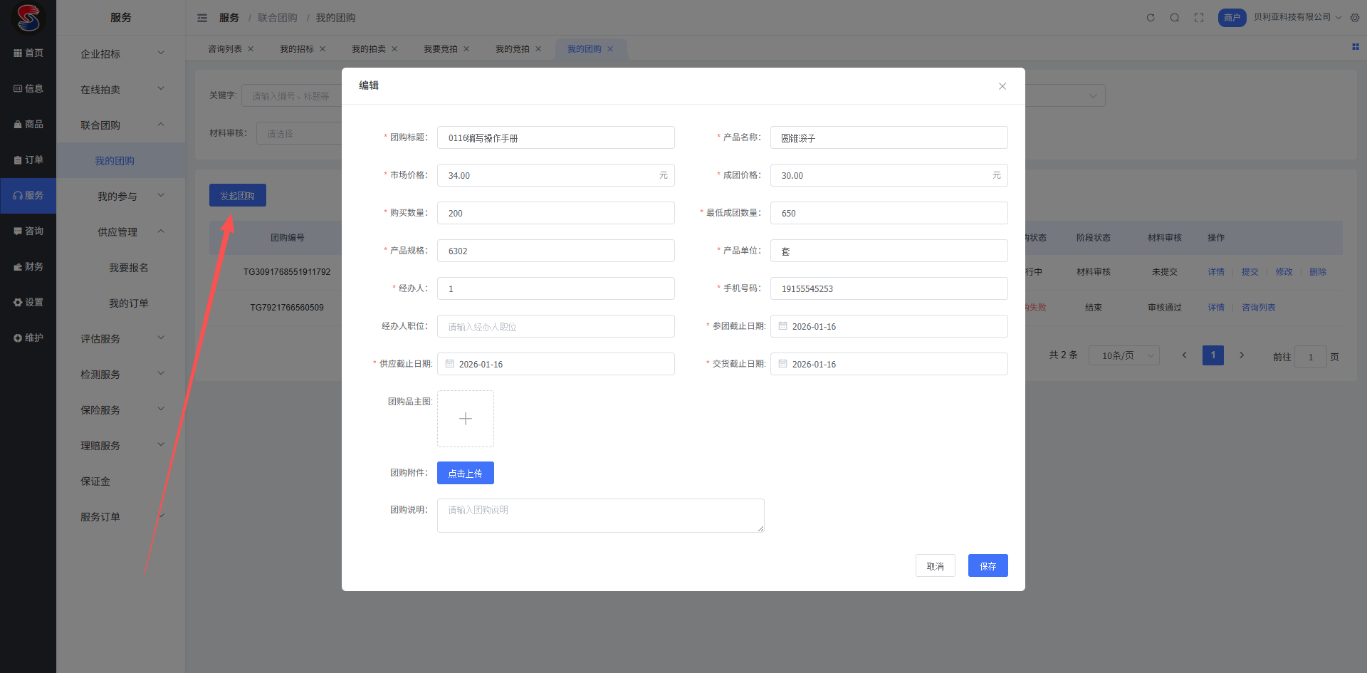 根据页面提示,详细填写团购商品、团购价、成团人数、活动时间等内容,确认无误后点击【保存】。