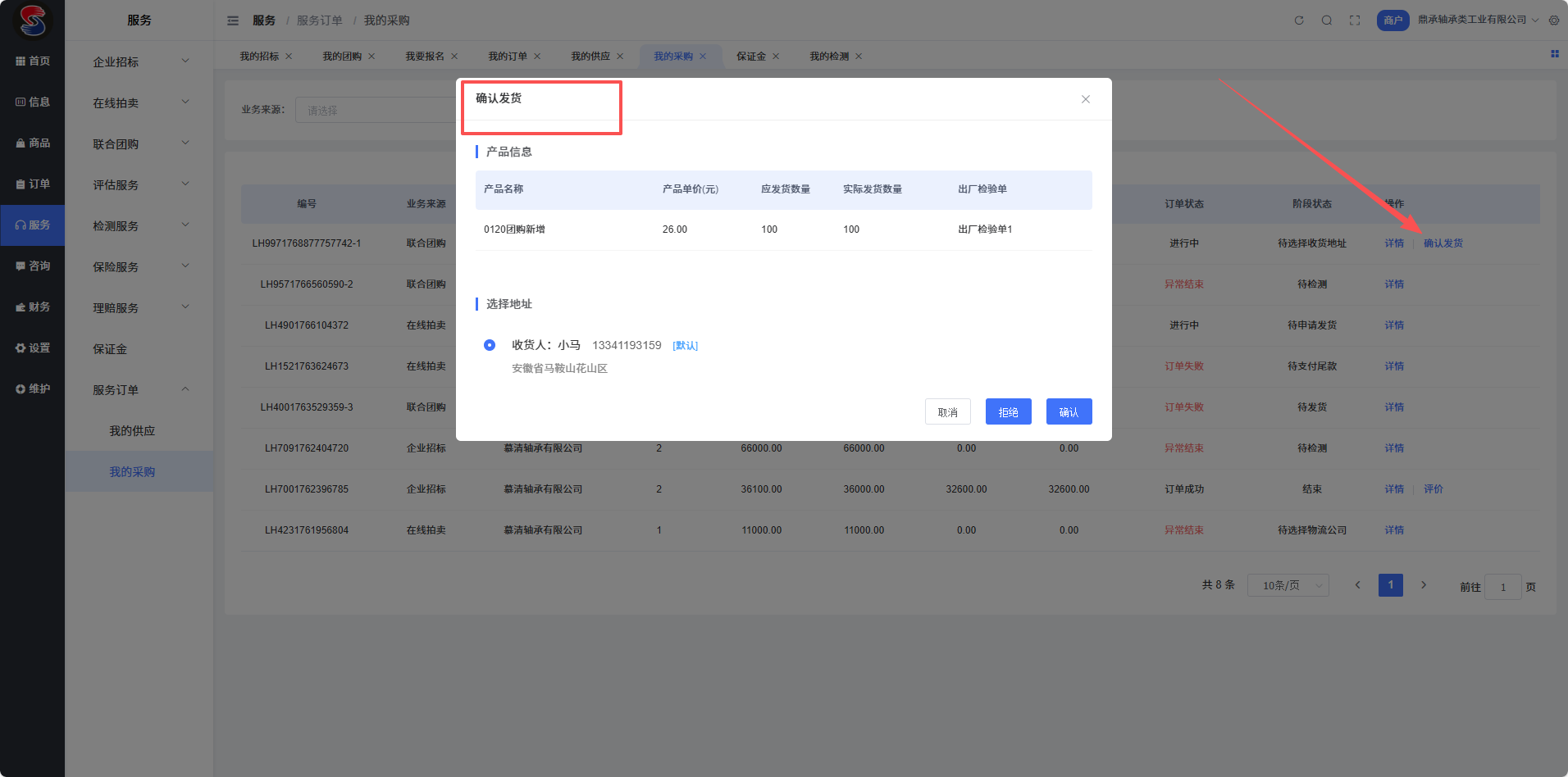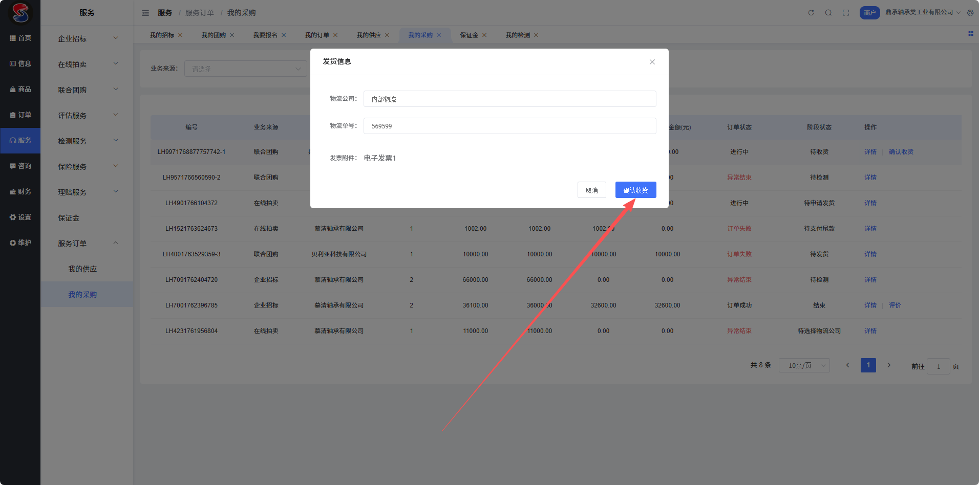登录商户后台,依次点击【服务】-【服务订单】,找到对应采购订单。当卖家发货后,订单状态变更为“待卖家选择物流公司”,请及时点击【确认发货】,以推进后续流程。