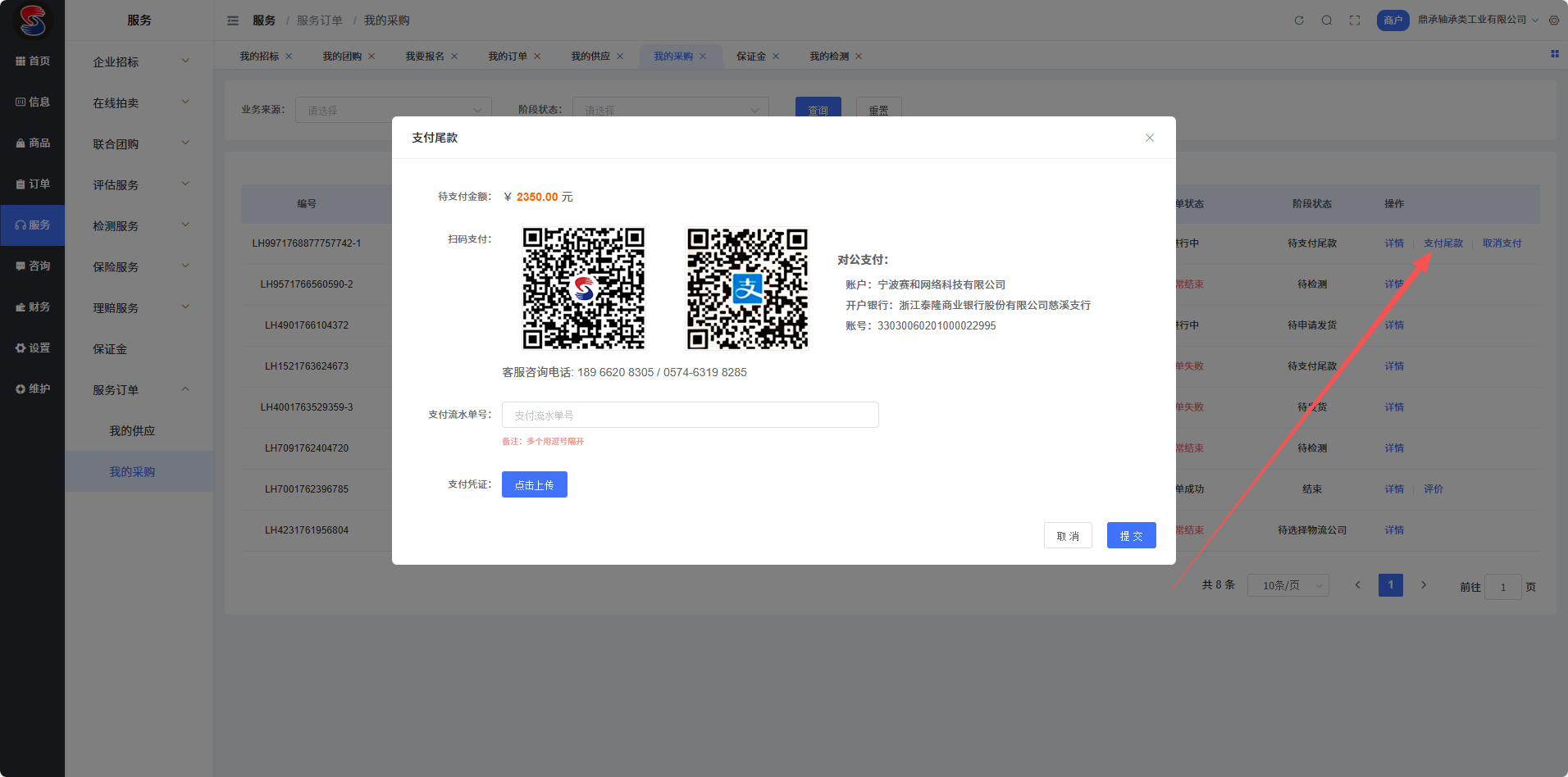 待物流信息确认后,订单进入尾款支付环节。点击【支付尾款】并完成支付操作,支付后订单状态将更新为“待平台确认支付”。