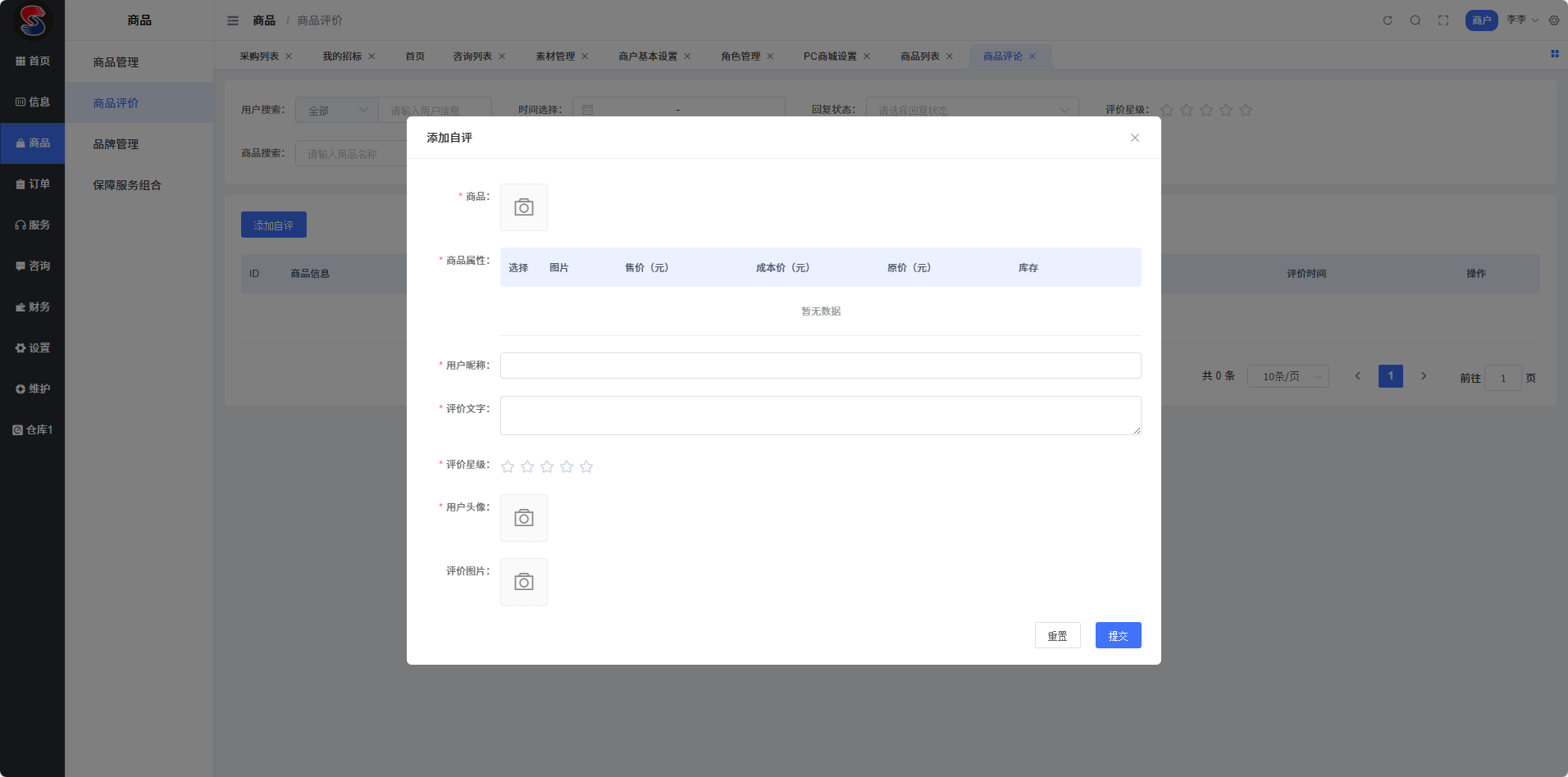 目录 搜索 配置商户的前置条件首页信息采购信息管理等7大模块商品商品管理商品评价品牌管理保障服务组合订单订单管理退款单服务企业招标我的招标我要投标我的投标在线拍卖我的拍卖我要竞拍我的竞拍联合团购我的团购我的参与我已参团我要参团供应管理我要报名我的订单评估服务我的评估我的订单检测服务我的检测我的订单保险服务我的保险我要接单我的订单理赔服务我的赔付我的理赔保证金服务订单我的供应我的采购咨询设置商户基本设置店铺设置物流设置运费模版商家地址管理管理权限角色管理管理员列表维护素材管理 敏感操作日志系统表单 暂无相关搜索结果! 本文档使用 MinDoc 发布 商品评价 #商品评价商品评价:【商品】–【商品评价】–【添加自评】文档更新时间: 2026-03-09 10:55 作者:Leo
