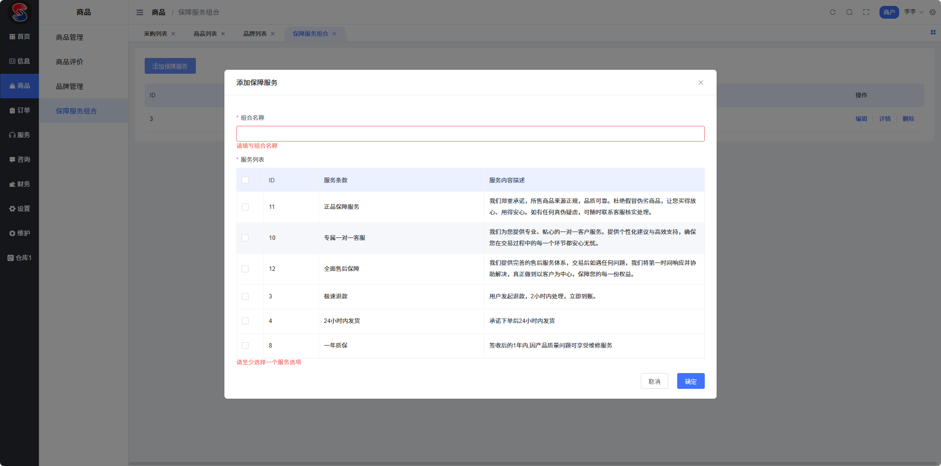 目录 搜索 配置商户的前置条件首页信息采购信息管理等7大模块商品商品管理商品评价品牌管理保障服务组合订单订单管理退款单服务企业招标我的招标我要投标我的投标在线拍卖我的拍卖我要竞拍我的竞拍联合团购我的团购我的参与我已参团我要参团供应管理我要报名我的订单评估服务我的评估我的订单检测服务我的检测我的订单保险服务我的保险我要接单我的订单理赔服务我的赔付我的理赔保证金服务订单我的供应我的采购咨询设置商户基本设置店铺设置物流设置运费模版商家地址管理管理权限角色管理管理员列表维护素材管理 敏感操作日志系统表单 暂无相关搜索结果! 本文档使用 MinDoc 发布 保障服务组合 #保障服务组合文档更新时间: 2026-03-07 11:25 作者:Leo