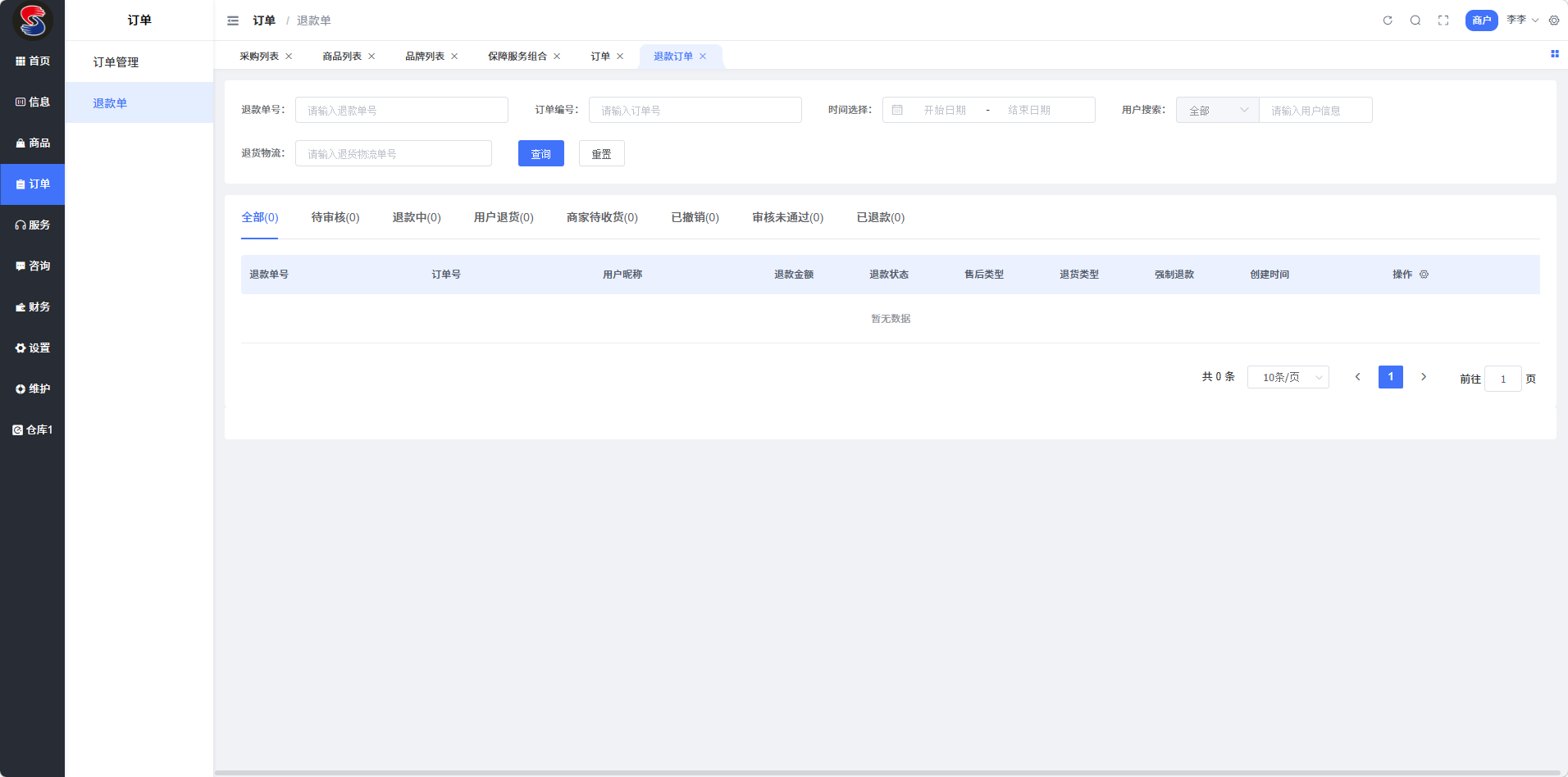 目录 搜索 配置商户的前置条件首页信息采购信息管理等7大模块商品商品管理商品评价品牌管理保障服务组合订单订单管理退款单服务企业招标我的招标我要投标我的投标在线拍卖我的拍卖我要竞拍我的竞拍联合团购我的团购我的参与我已参团我要参团供应管理我要报名我的订单评估服务我的评估我的订单检测服务我的检测我的订单保险服务我的保险我要接单我的订单理赔服务我的赔付我的理赔保证金服务订单我的供应我的采购咨询设置商户基本设置店铺设置物流设置运费模版商家地址管理管理权限角色管理管理员列表维护素材管理 敏感操作日志系统表单 暂无相关搜索结果! 本文档使用 MinDoc 发布 订单管理 #订单模块使用功能展示订单管理:商户后台的订单模块通常是处理所有交易的核心页面,其核心功能是让卖家集中查看、管理和处理各类订单。主要操作是根据不同的状态来操作对应按钮 退款单:同上理,此模块还在开发完善中文档更新时间: 2026-03-07 13:09 作者:Leo