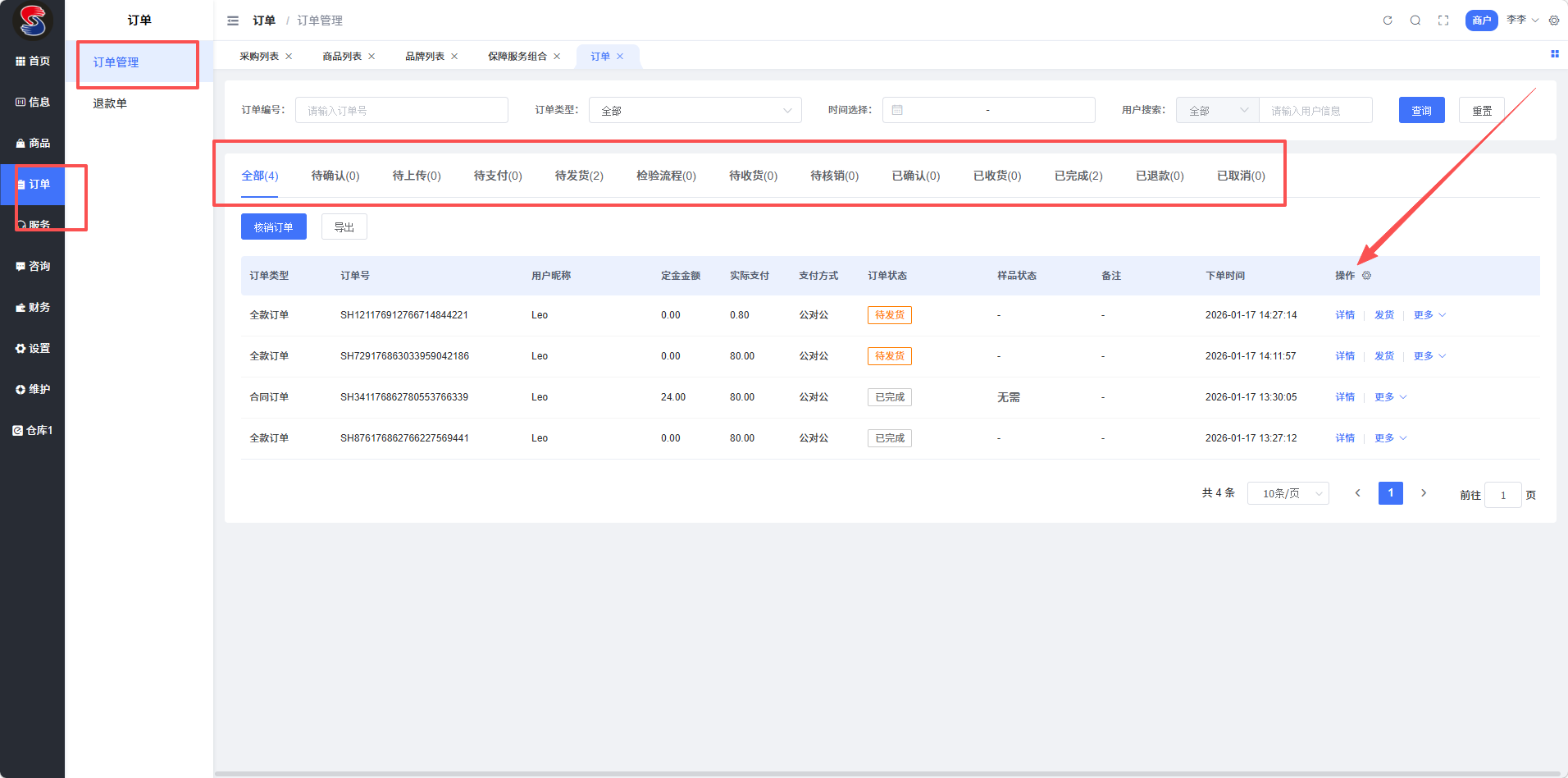 #订单模块使用功能展示订单管理:商户后台的订单模块通常是处理所有交易的核心页面,其核心功能是让卖家集中查看、管理和处理各类订单。主要操作是根据不同的状态来操作对应按钮 退款单:同上理,此模块还在开发完善中文档更新时间: 2026-03-07 13:09 作者:Leo