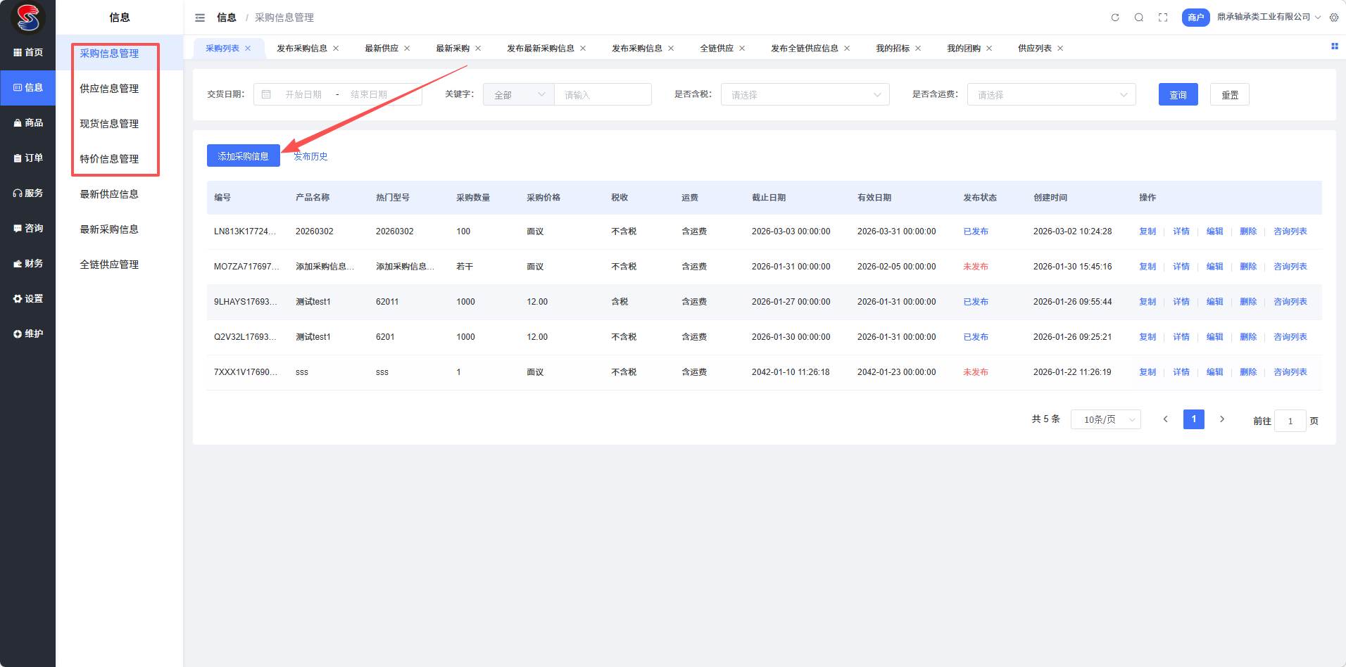 发布入口:登录商户管理后台,依次点击【信息】→【采购信息管理】→【添加采购信息】