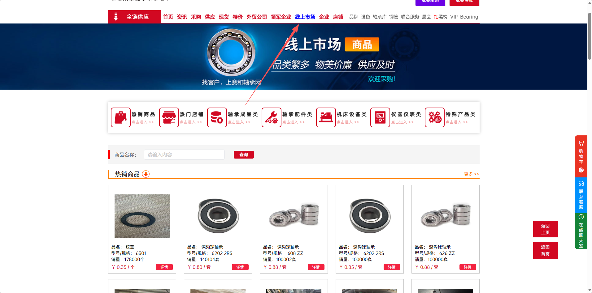 顶部导航栏:线上市场模块提供各主要频道的快速切换入口,方便随时跳转。(包括热销商品热门店铺等7大模块)