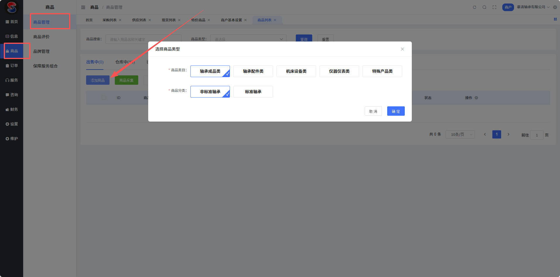 商户路径:商品–商品管理–添加商品–选择对应的商品类目以及商品分类