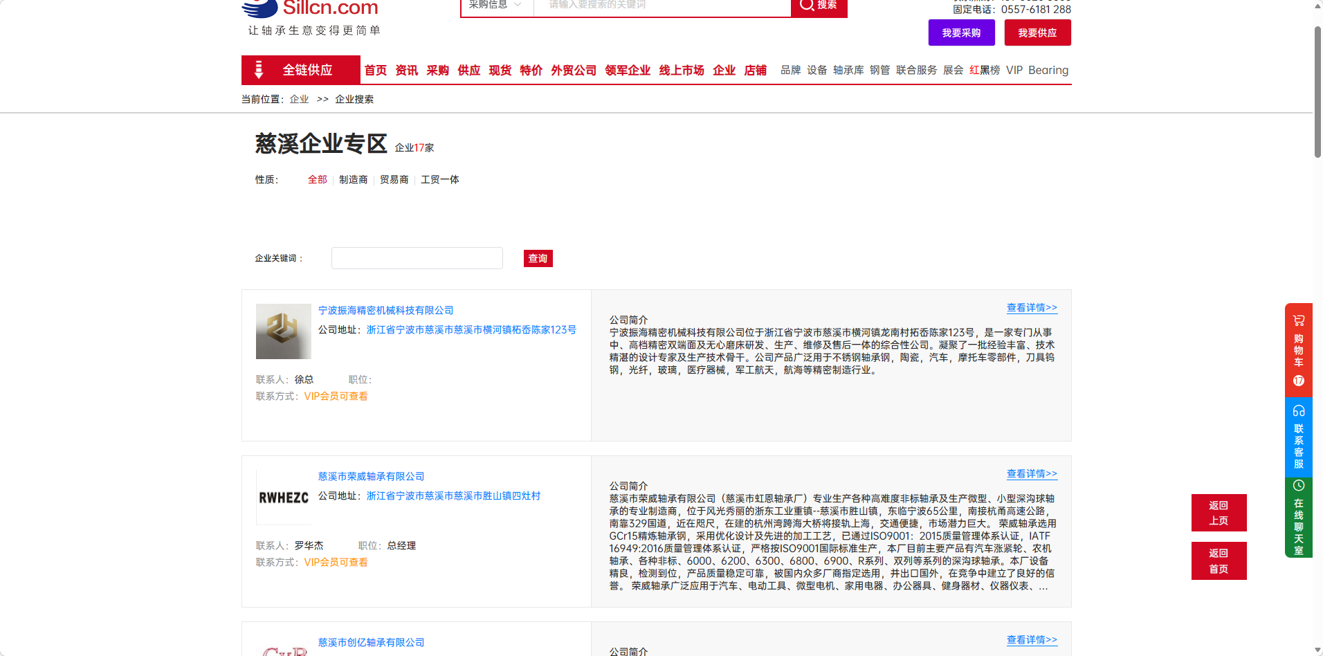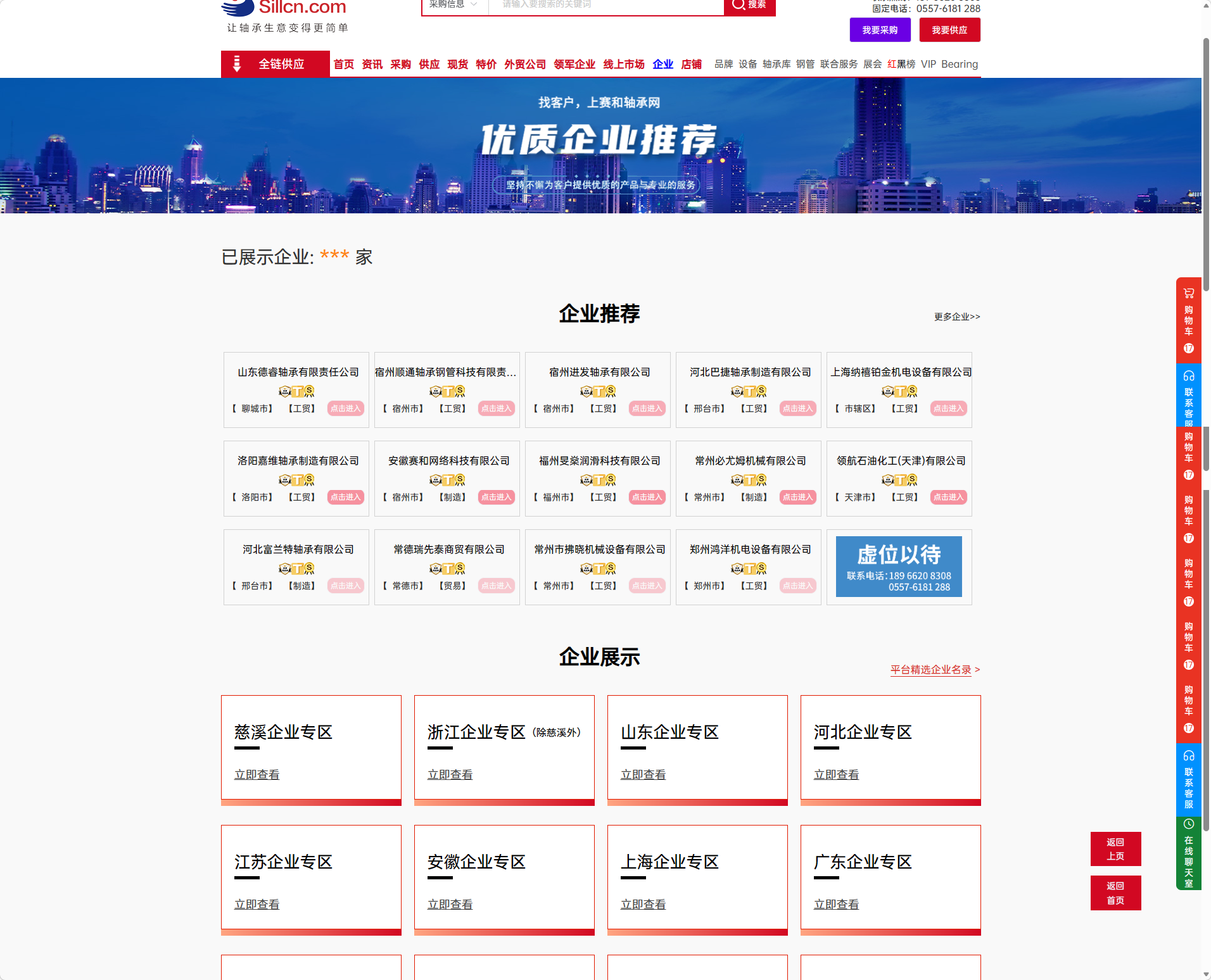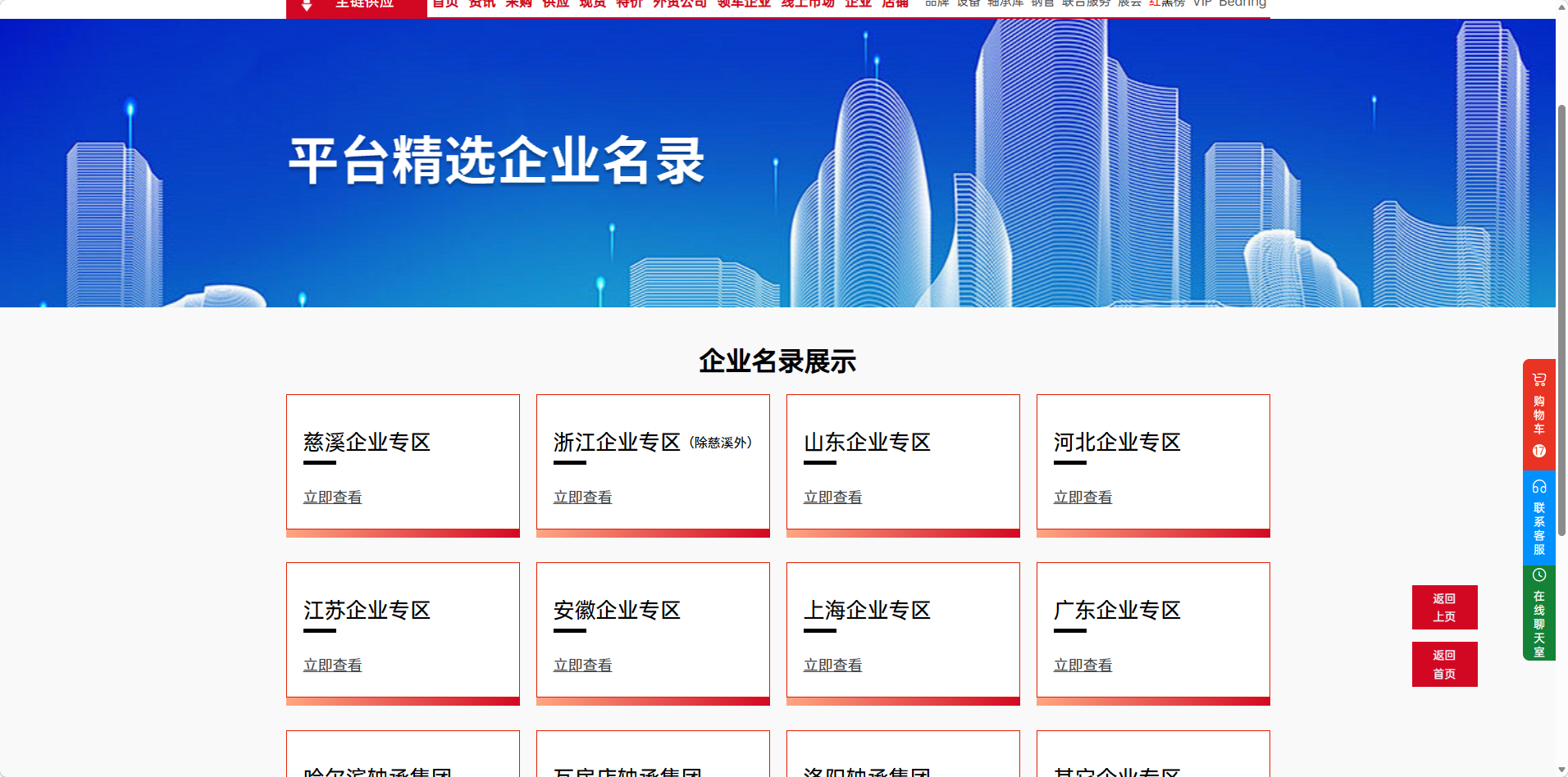 展示形式:按地区划分的快速入口区域,如“慈溪企业专区”、“江苏企业专区”、“安徽企业专区”等。