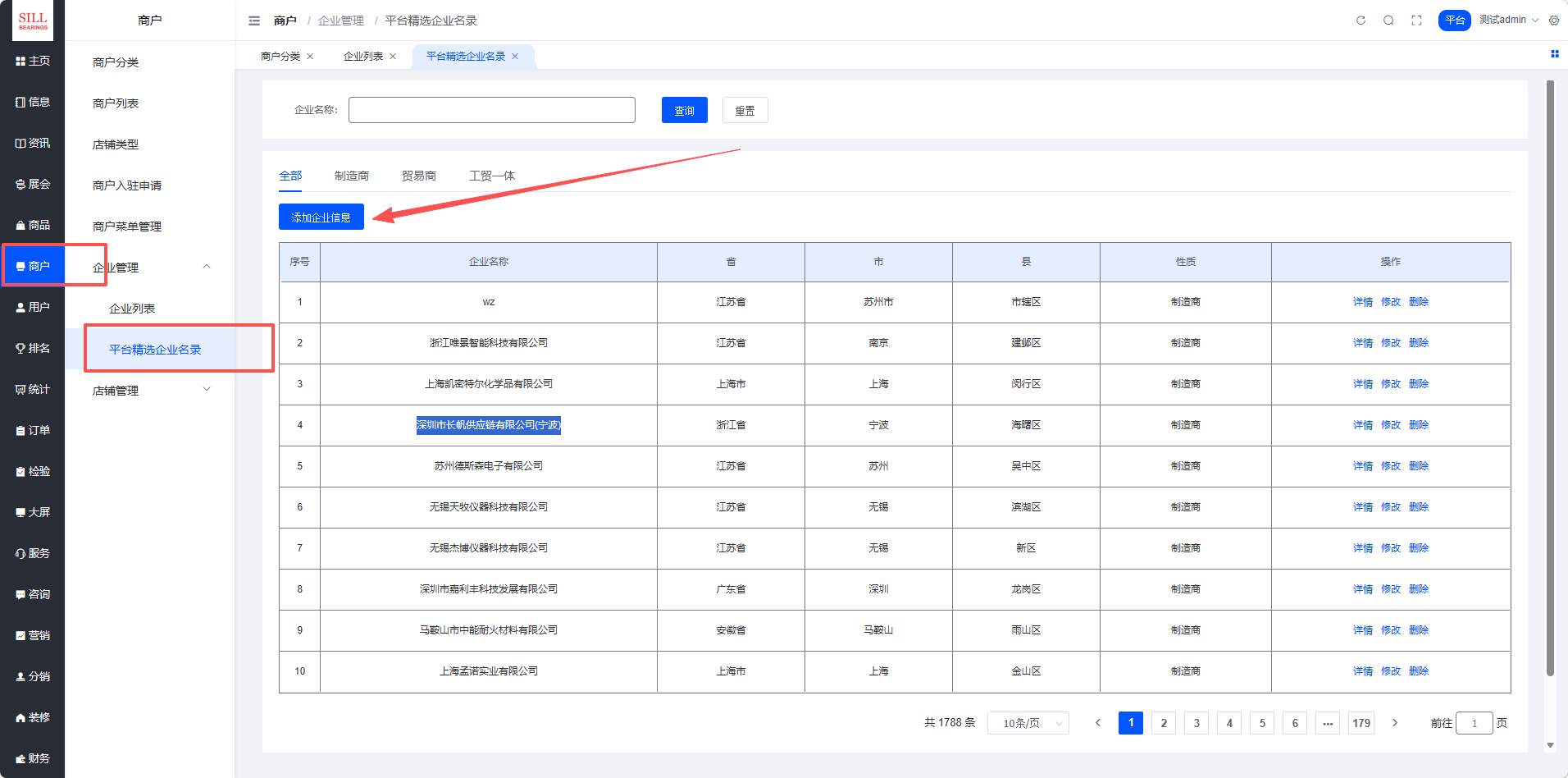平台路径:商户–平台精选企业名录–添加企业信息(支持增删改查)