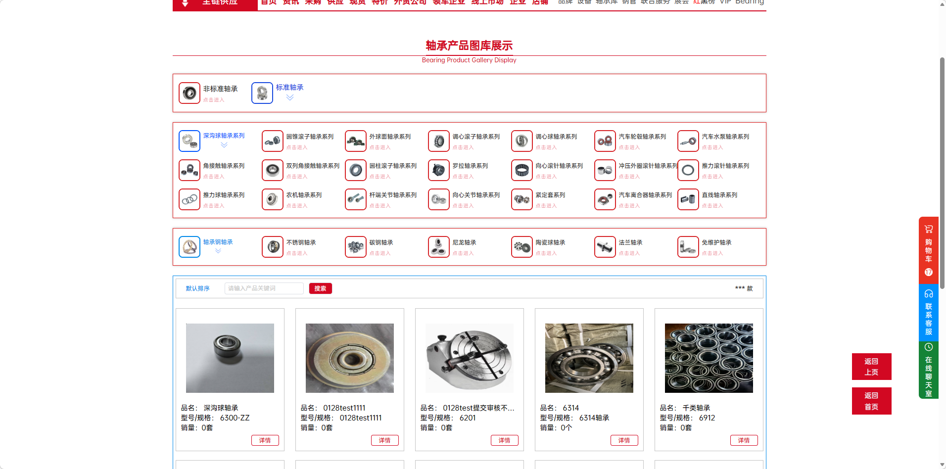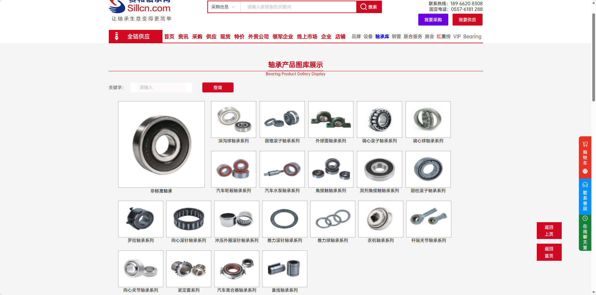 展示形式:页面以直观的卡片形式,集中展示了平台的轴承产品分类。