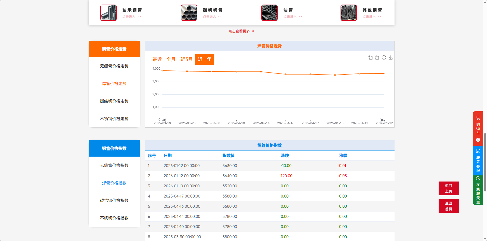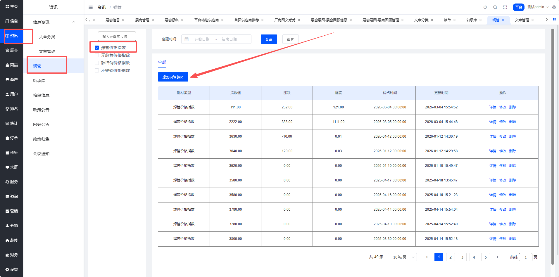 #钢管功能展示说明快捷导航栏 钢管类别,点击模块跳转到商品详情,方便直接购买后台配置与管理 钢管生产厂家、钢管经销商、优质钢管厂家推荐、钢管产品展示后台配置与管理 钢管价格走势图、钢管价格指数图后台配置与管理平台路径:【咨询】–【钢管】–【过滤关键类型】–【添加钢管趋势】文档更新时间: 2026-03-04 15:58 作者:Leo