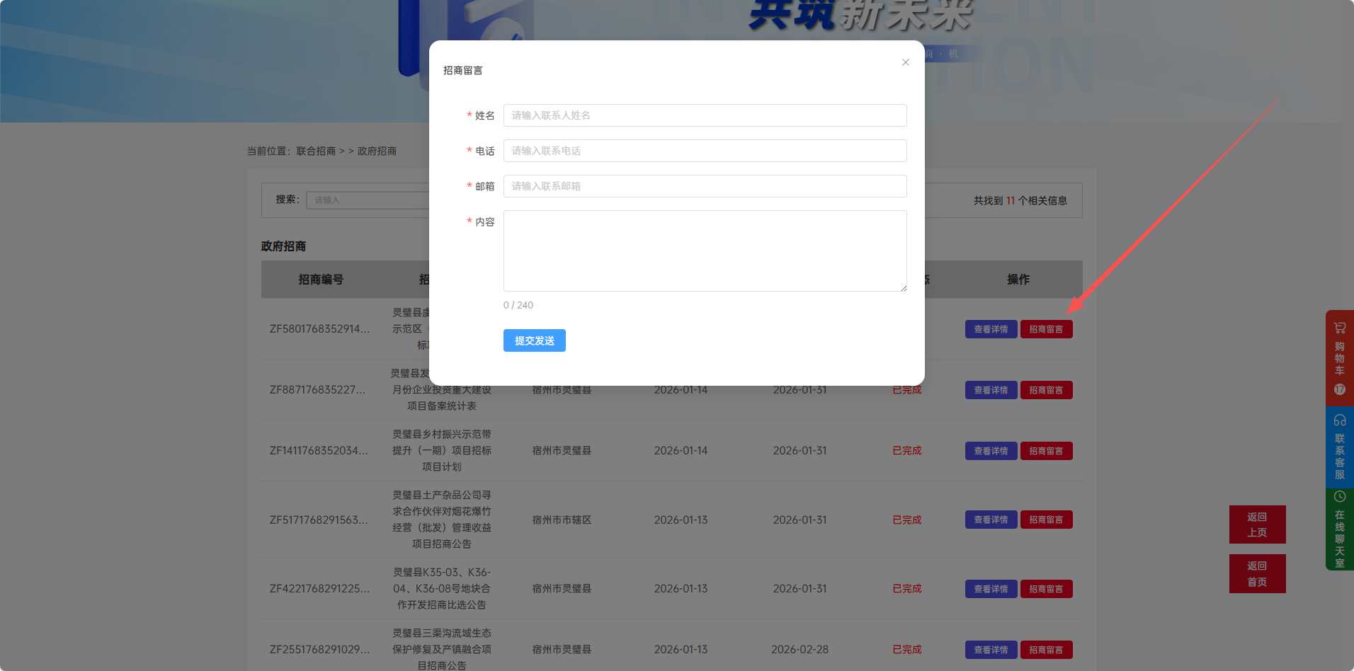 点击闪烁的【点击进入】,在操作中可进行【招商留言】