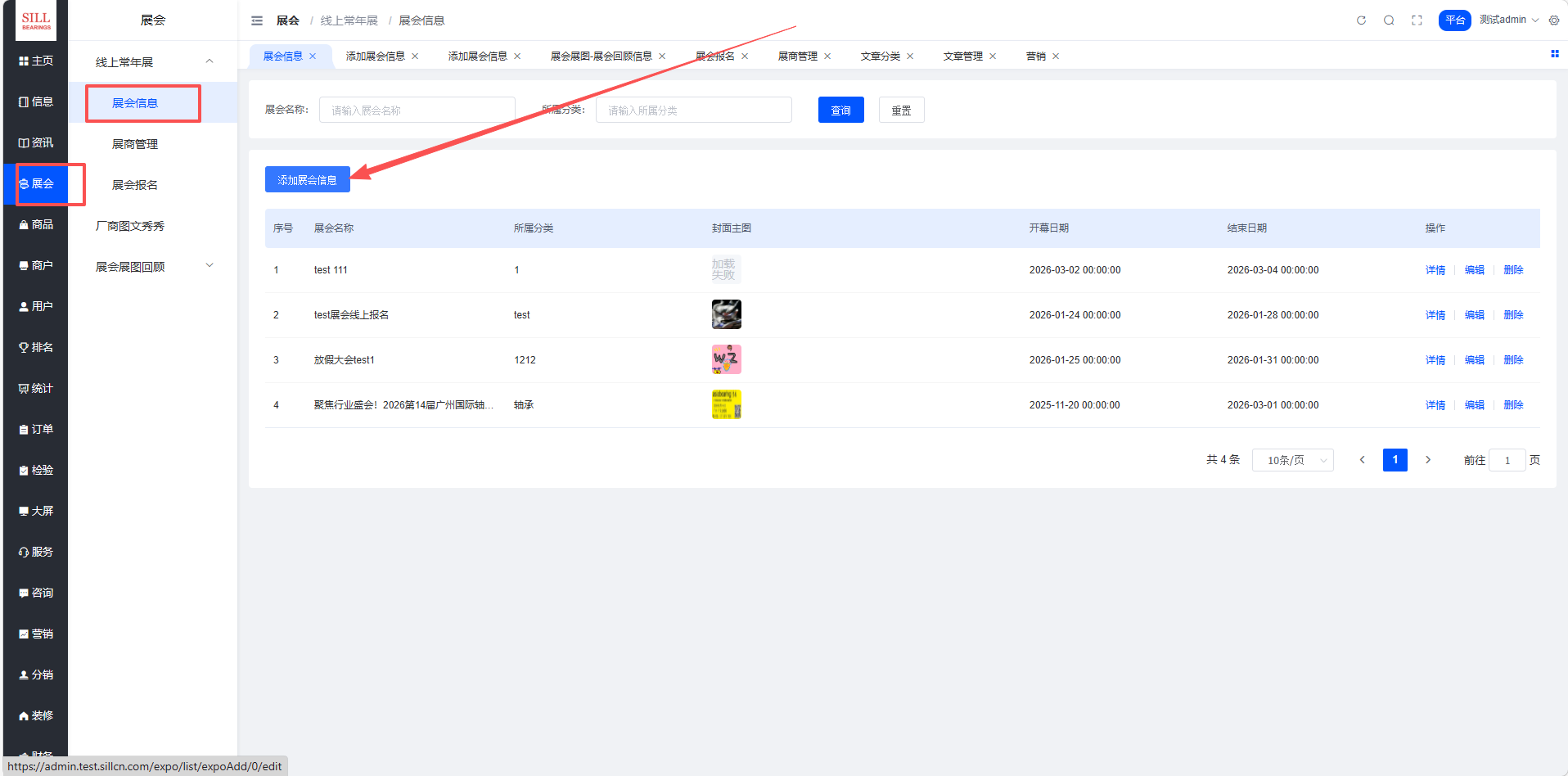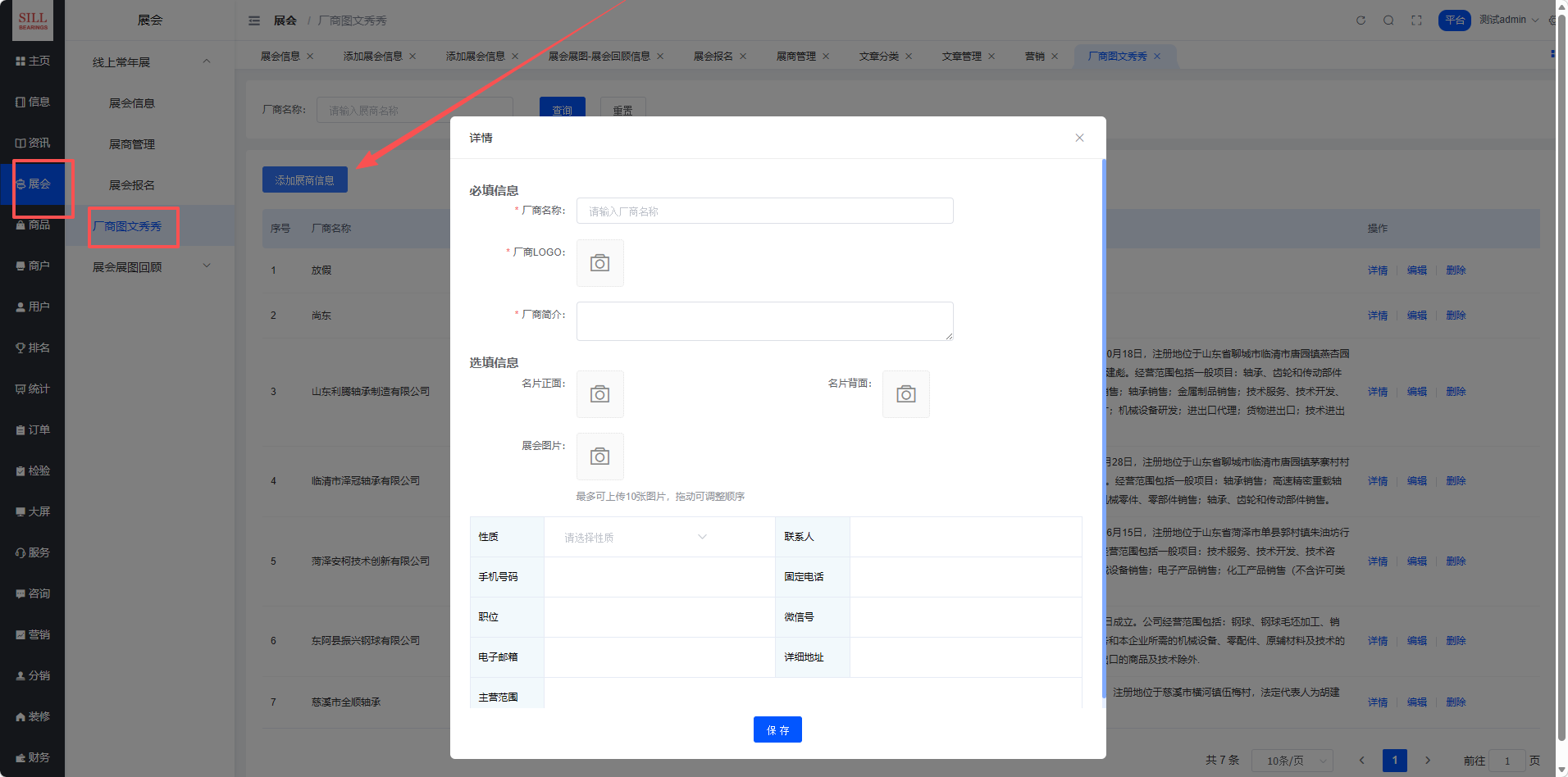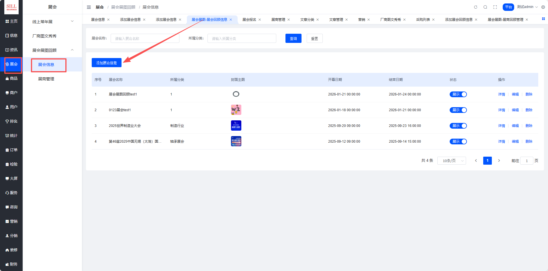 平台路径:【展会】–【线上常年展-展会信息】–【添加展会信息】