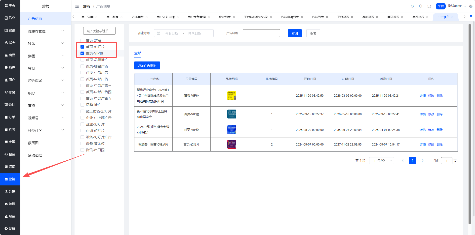 设置路径:平台端 → 营销 → 广告信息 → 关键字过滤 → 勾选首页幻灯片和首页VIP位 → 点击修改