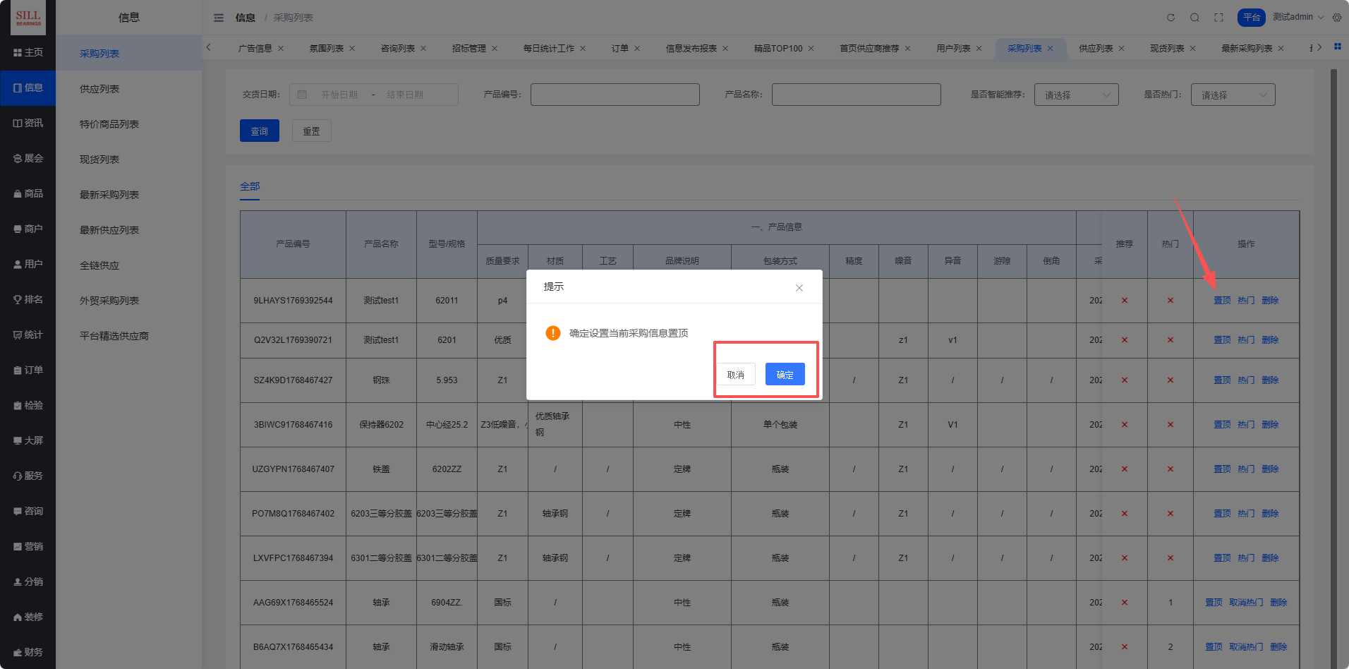 前端同步:完成后台的“置顶”后,这些被选中的信息会自动同步更新到前端的“智能推荐”或“最新货源”板块中,从而实现对前台展示内容的精准调控。