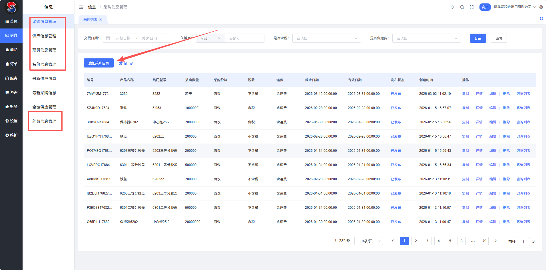 发布入口:登录商户管理后台信息模块→【采购信息管理】/【供应信息管理】等→【添加采购信息】→ 保存并发布 → 实现对前台内容的展示