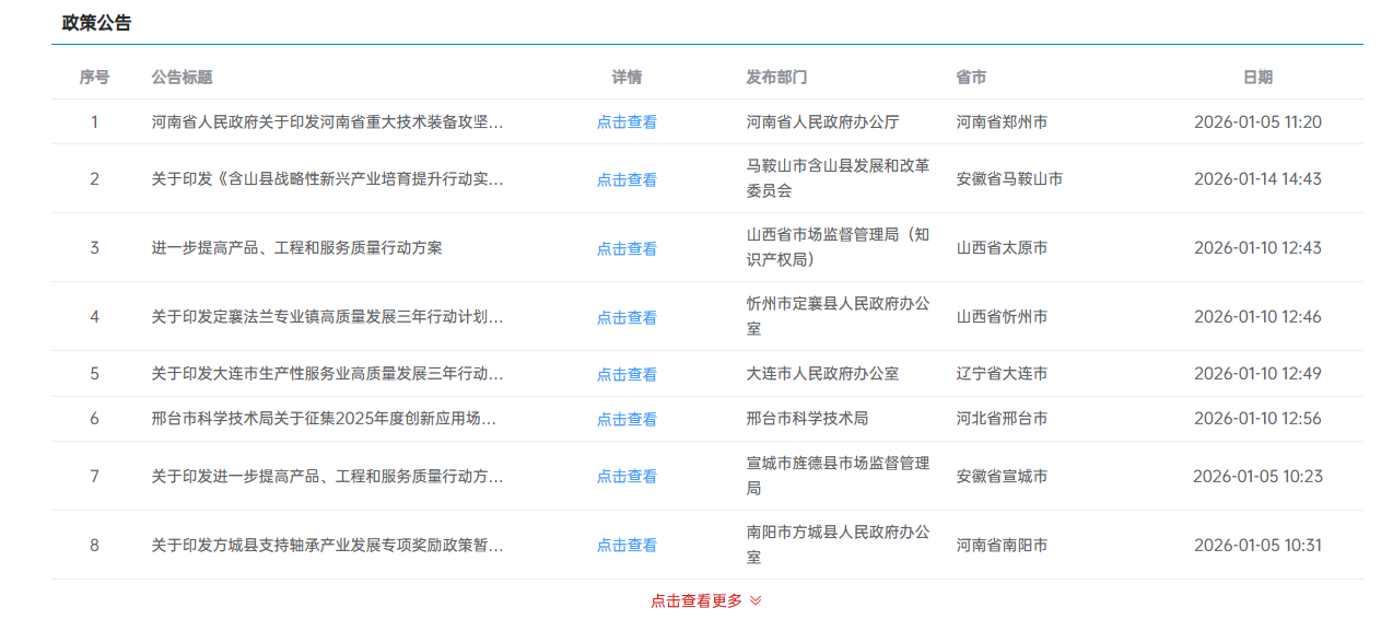 页面功能:集中、系统地展示各级政府、行业机构发布的与轴承产业相关的政策文件、通知公告和行业法规。