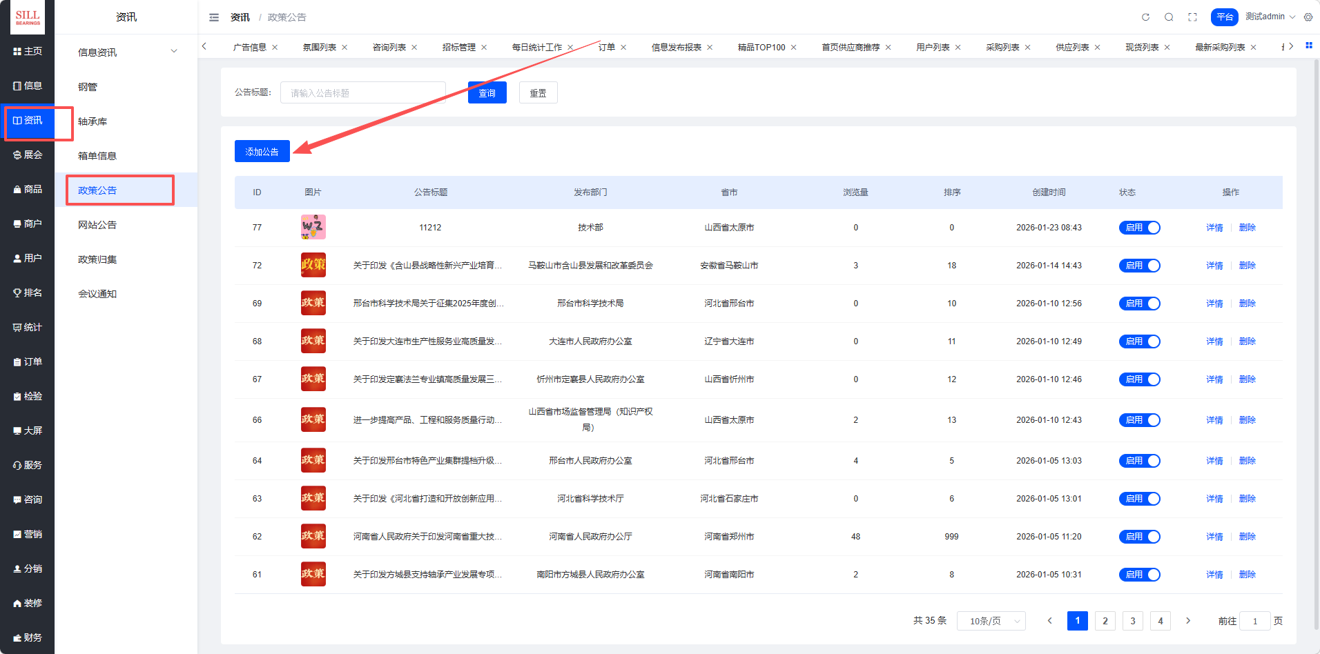 管理入口:登录平台管理后台,在主导航菜单中找到并进入【资讯】模块,接着【政策公告】,点击【添加公告】。
