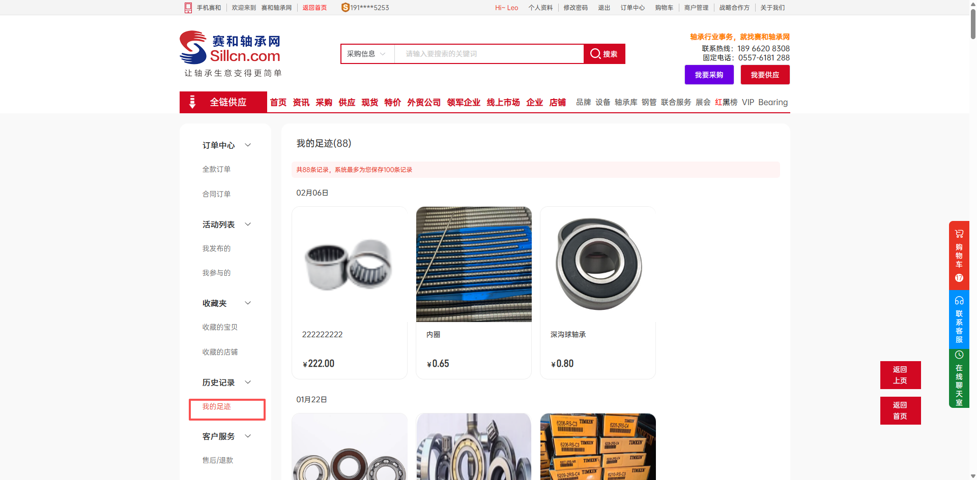 目录 搜索 赛和网介绍登录注册认证商户个人资料修改密码订单中心订单中心全款订单合同订单活动列表我发布的我参与的收藏夹收藏的宝贝收藏的店铺历史记录我的足迹客户服务售后/退款我的咨询账户设置收货地址个人资料账号密码规则协议购物车商户管理我要采购/我要供应全链供应首页一板块-广告信息二板块-品牌推广三板块-赛和小店四板块-智能推荐五板块-公共信息平台六板块-赛和进出口等6大板块七板块-供应商推荐八板块-政策公告九板块-政策归集十板块-会议通知十一板块-活动公告资讯采购、供应、现货、特价外贸公司、领军企业线上市场企业店铺品牌设备轴承库钢管联合服务展会红黑榜VIPBearing 暂无相关搜索结果! 本文档使用 MinDoc 发布 我的足迹 #我的足迹功能说明 “我的足迹”自动记录您在平台内浏览过的商品与页面,帮助您轻松回溯访问历史,避免遗漏感兴趣的内容。 温馨提示:足迹信息仅您本人可见,我们不会将其用于其他用途,请放心使用。您可以在“个人中心-我的足迹”中随时查看或清理浏览记录。文档更新时间: 2026-02-06 16:08 作者:Leo