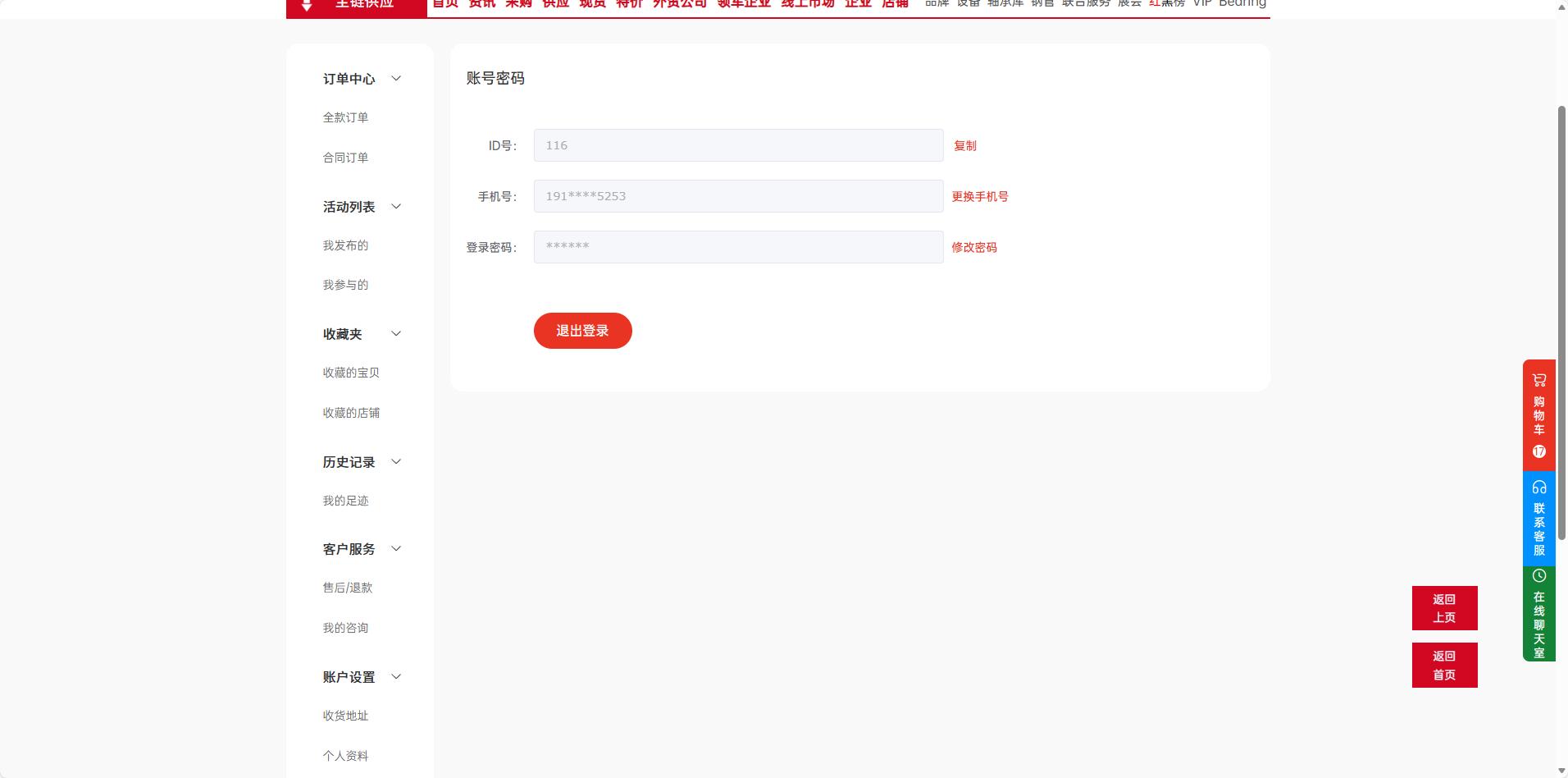目录 搜索 赛和网介绍登录注册认证商户个人资料修改密码订单中心订单中心全款订单合同订单活动列表我发布的我参与的收藏夹收藏的宝贝收藏的店铺历史记录我的足迹客户服务售后/退款我的咨询账户设置收货地址个人资料账号密码规则协议购物车商户管理我要采购/我要供应全链供应首页一板块-广告信息二板块-品牌推广三板块-赛和小店四板块-智能推荐五板块-公共信息平台六板块-赛和进出口等6大板块七板块-供应商推荐八板块-政策公告九板块-政策归集十板块-会议通知十一板块-活动公告资讯采购、供应、现货、特价外贸公司、领军企业线上市场企业店铺品牌设备轴承库钢管联合服务展会红黑榜VIPBearing 暂无相关搜索结果! 本文档使用 MinDoc 发布 账号密码 #账号密码管理说明进入账号密码页面在个人中心点击【账号密码】,即可进入账号安全管理页面,对登录密码进行修改操作。修改密码流程见菜单第5行 温馨提示:为保障账户安全,建议定期更换密码,并避免使用过于简单的组合。修改密码后,您在其他设备上的登录状态可能会被登出,需重新登录。如忘记原密码,可通过登录页的“忘记密码”功能,使用手机验证码重置。 文档更新时间: 2026-03-01 13:56 作者:Leo